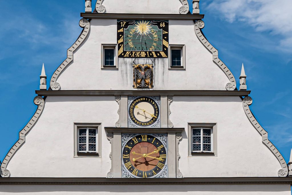 Die historische Stadt Rothenburg ob der Tauber im mittelfränkischen Bayern ist nahezu vollständig erhalten und bietet zahlreiche Beispiele für mittelalterliche Architektur, darunter Fachwerkhäuser, gepflasterte Straßen und Stadtmauern. Der Marktplatz ist das Herz der Stadt und wird vom imposanten Rathaus dominiert.